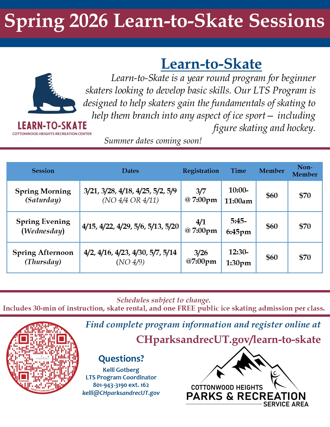 This is a year-round skating program for beginners that are looking to develop basic skating skills while having fun. Classes help all skaters learn basic technique in the sports of figure skating and hockey. The program is designed so skaters will progress through various skill levels learning to skate forward and backward, stop, do crossovers, as well as a variety of other skills. Classes are taught by Cottonwood Heights Recreation Center’s qualified skating staff to ensure proper learning, safety and a fun experience for skaters of all ages and abilities. (Specialty classes are also offered.)